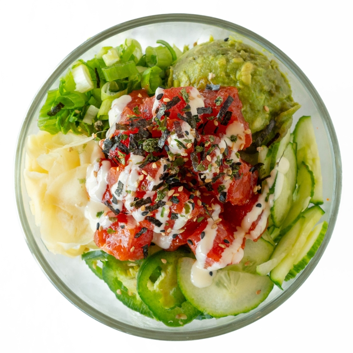 Tuna Poke, red onions, scallions, cucumber, wakame, avocado, sprouts, pickled ginger with Classic shoyu sauce