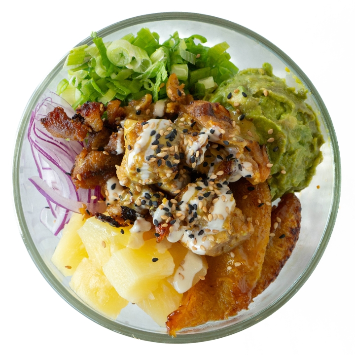 Curry chicken, smashed Avo, maduros, black beans, red onions, pineapple, scallion top white garlic & sesame seeds.