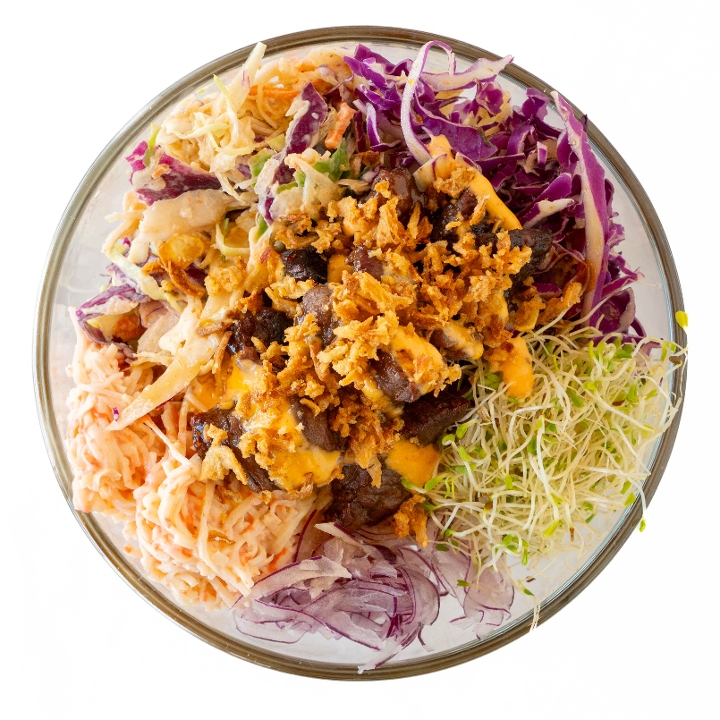 Steak teriyaki, kani salad, asian slaw, red onion, red cabbage, sprouts, top da bomb & Crispies