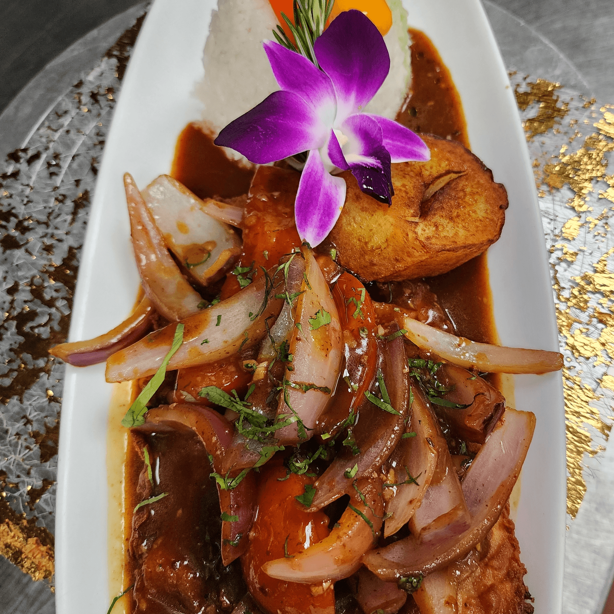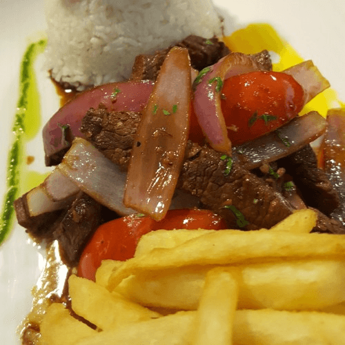 Aji's, garlic, onions, cilantro, tomatoes, papa dorada. Served with steamed rice