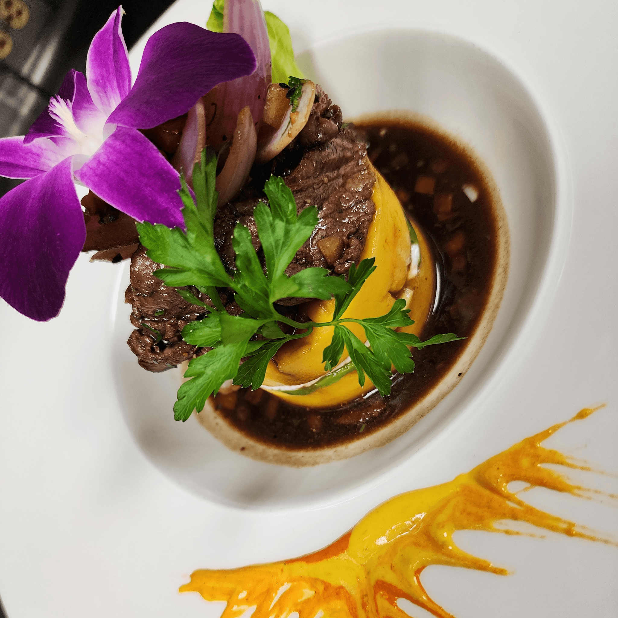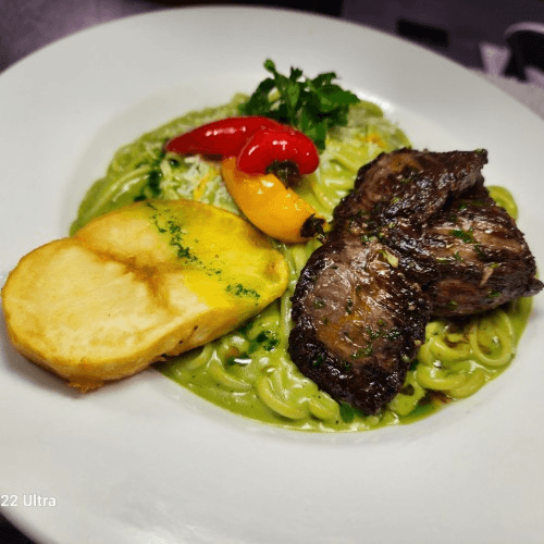 Creamy risotto topped with bites of beef tenderloin sautéed with mushrooms & onions, peppers in a aji panca-amarillo demi glace