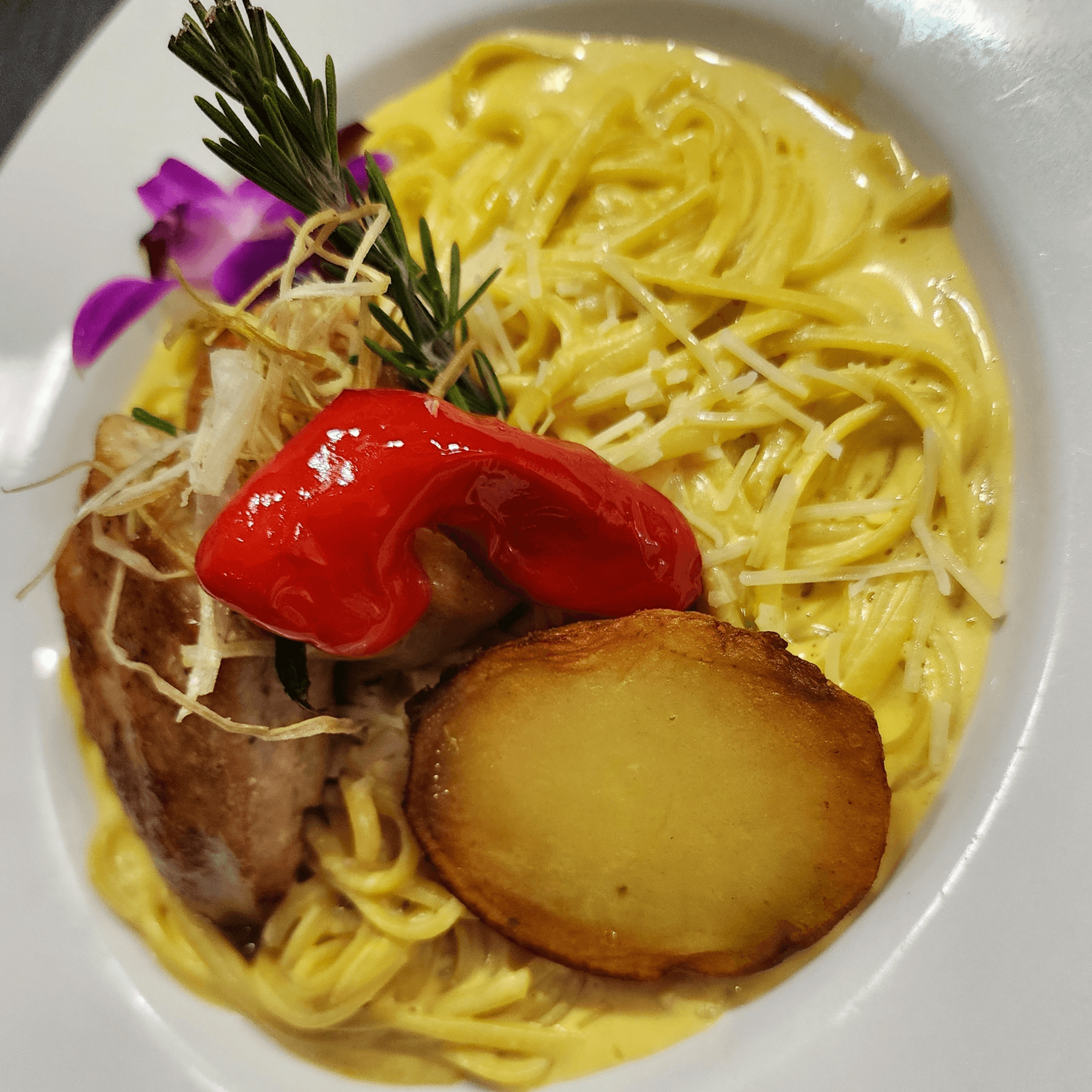 Linguini tossed in a creamy huancaina, reggiano cheese