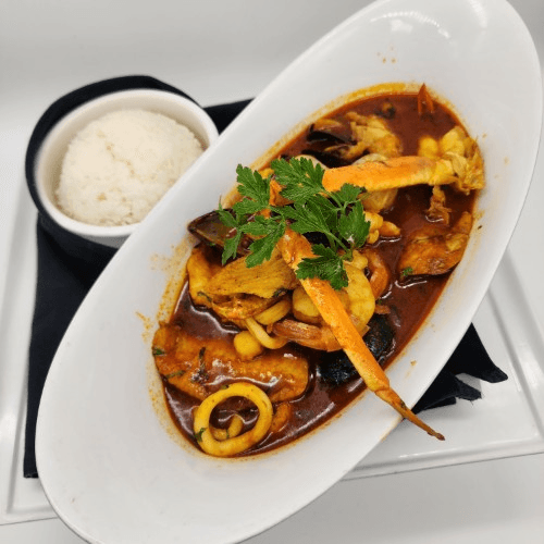 Seafood casserole slowly cooked with tomatoes, onions, beer & served with rice