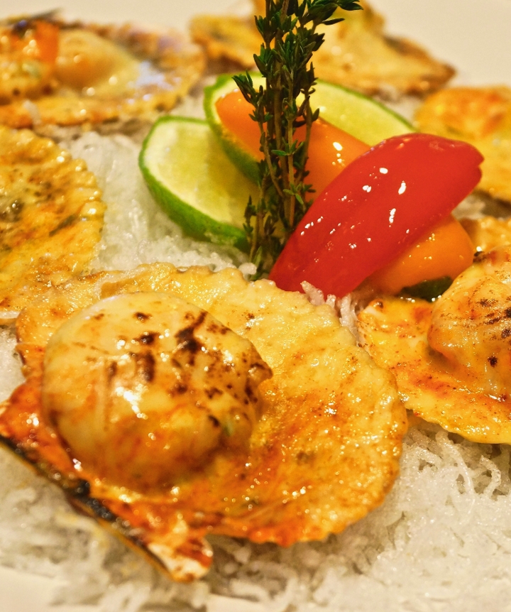 Lobster, scallops, shrimp, octopus, fish, calamari en tres cremas, canchas and cusco corn