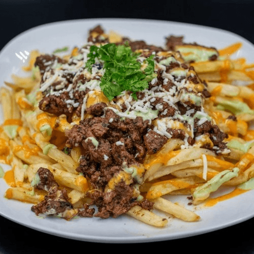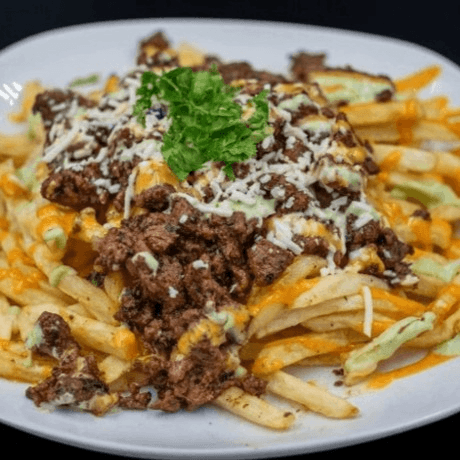 French fries topped off with choice of protein, queso fresco, cilantro, pickled red onions, crema & honey sriracha