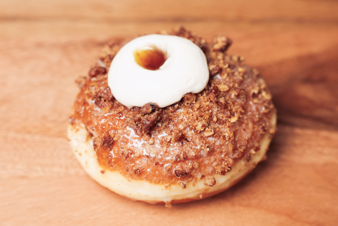 24 hr brioche donut filled with maple-pecan Bavarian cream, cloaked in a brown butter pecan glaze, and topped with candied pecan crumble. At its center, a maple reduction “portal” pulls you straight into the Other Side.