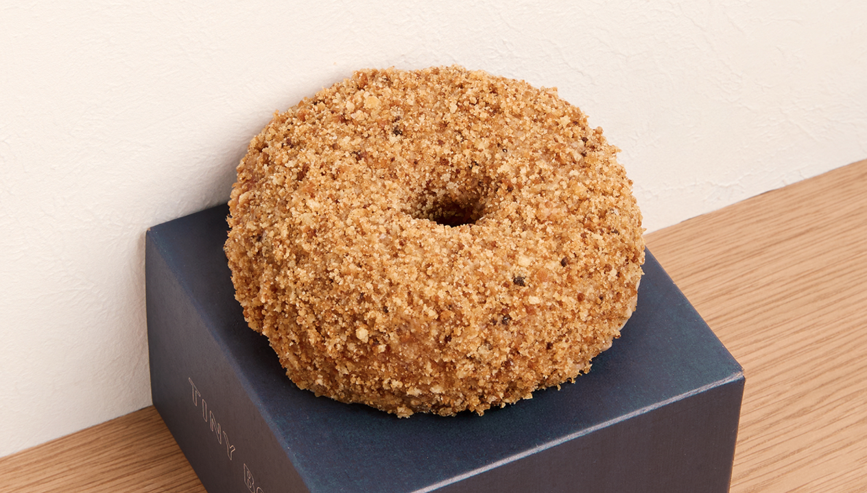 24 hr brioche donut filled with whipped coffee cream, dipped in milk glaze and covered in coffee cake crumbs.
