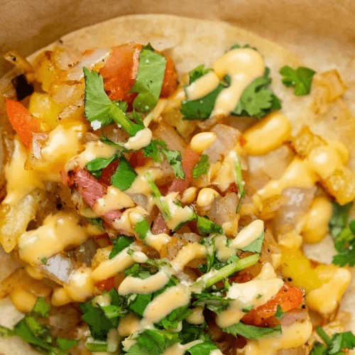 Fried corn tortilla filled with choice of protein, cheese & toppings with our signature sauces drizzled over