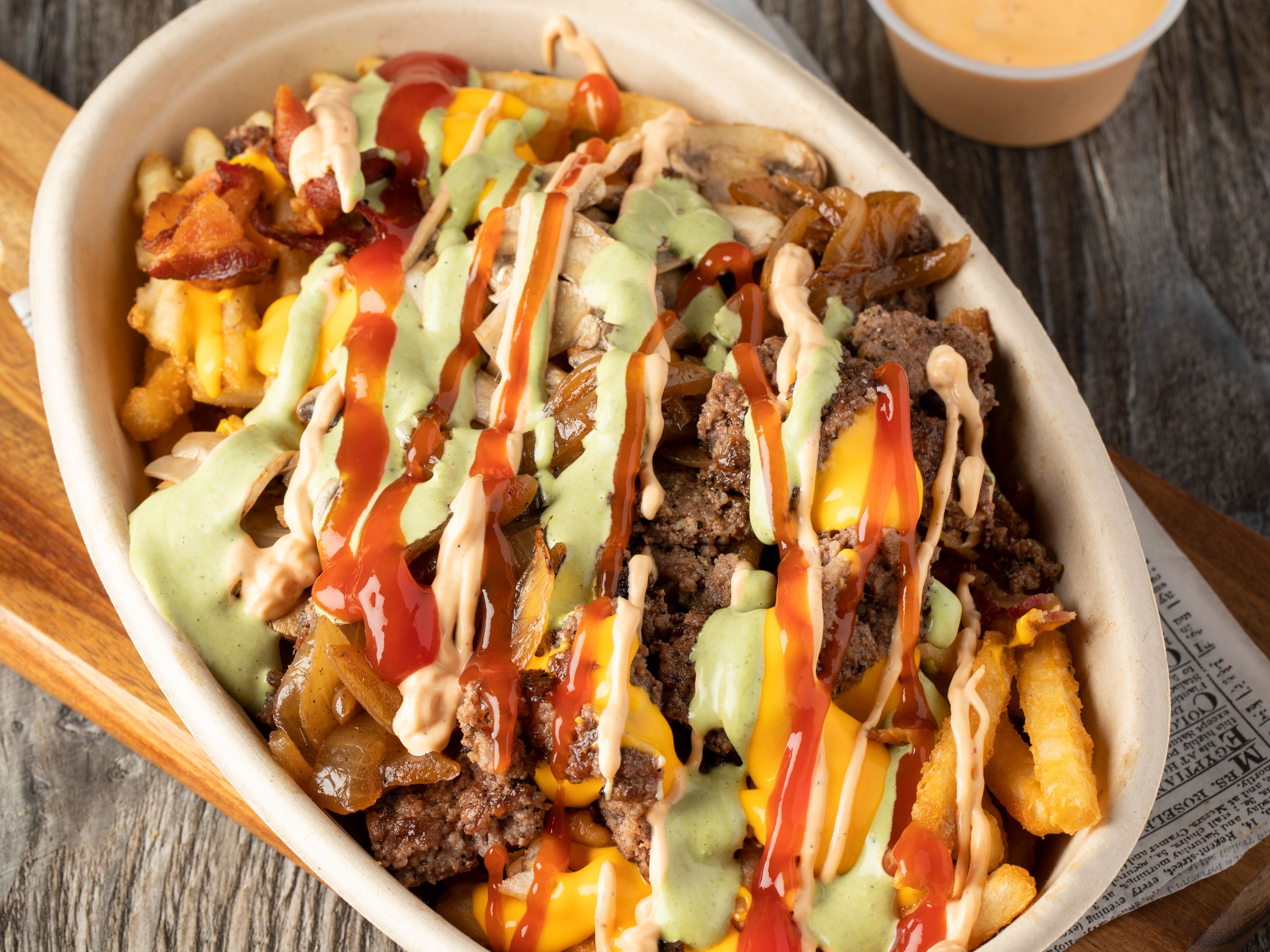 Crispy Fries Base , Black Angus Meat, Cheddar Cheese, Grilled onions, Grilled Mushroom, Bacon, Garlic Chipotle, Cilantro Sauce and Ketchup.