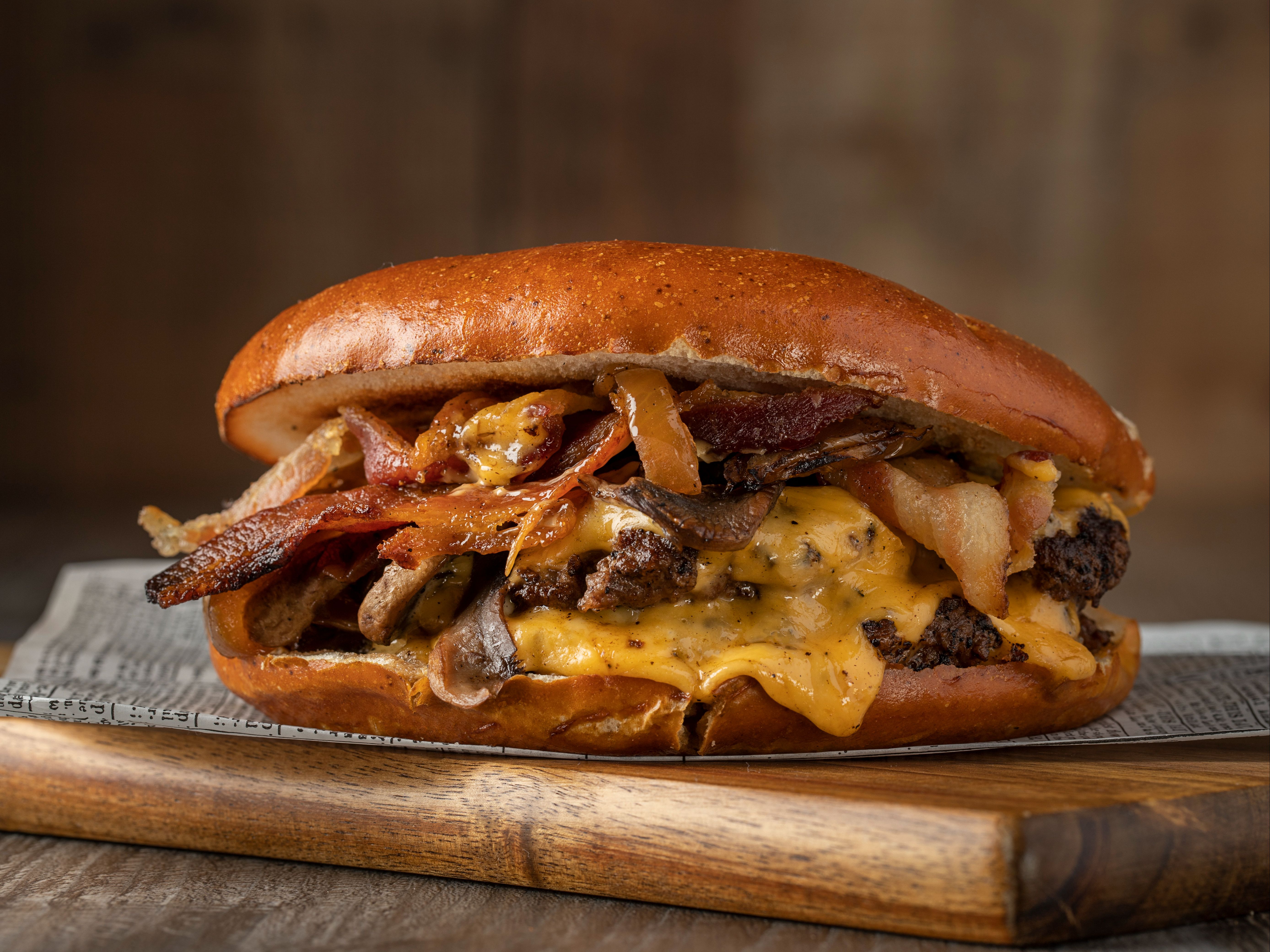 Pretzel Bun, Double Black Angus Meat, American Cheese, Grilled onions, Grilled Mushroom, Bacon, Garlic Chipotle and Cilantro Sauce.