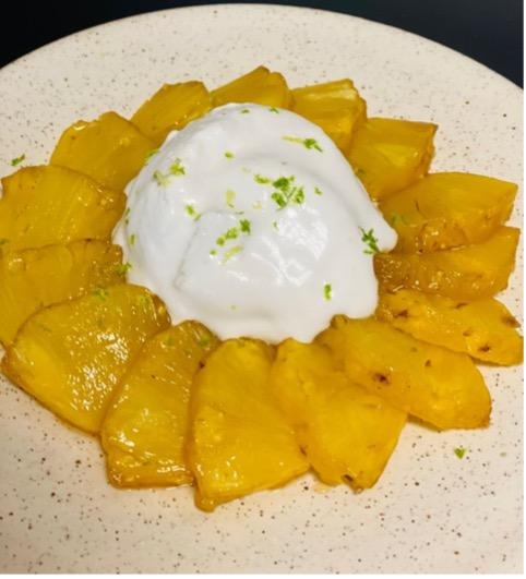 Anana or pineapple is smoked then glazed with a brown sugar syrup. Served by slicing thin in the style of a tiradito. Home made coconut sorbet on top. Garnished with lime zest. Allergies = Dairy, Pineapple.