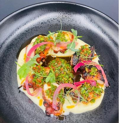 We cook the octopus in olive oil and herbs confit for 3 hours. The cream is made with Peruvian purple Botija Olives, Mayo, yogurt Crackers. It is a traditional Peruvian sauce. The octopus is sliced and arranged on plate and topped with cream. Garnished with capers, avocado dices, red pepper and micro cilantro. Allergies = Octopus, Egg, Dairy