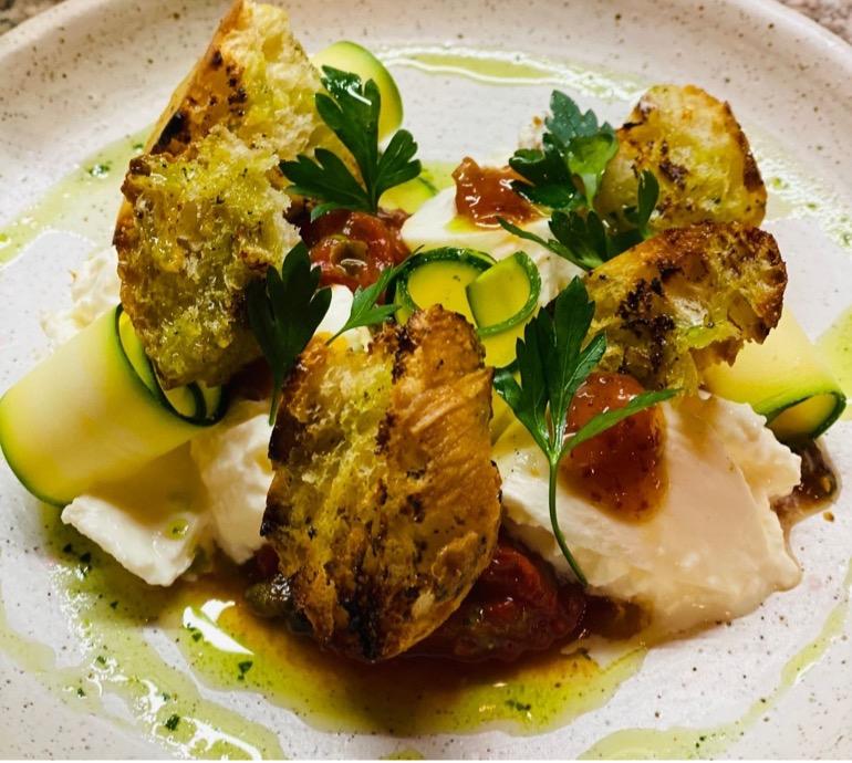 Burrata is torn into pieces and seasoned with pepper. Zucchini is shaved thin and rolled. Peaches are caramelized on the grill with agave. Oregano vinaigrette is made with fresh oregano, lemon and herbs. Allergies = Garlic, Dairy.