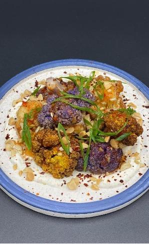 Cauliflower is deep fried and tossed in sweet chili sauce. Sour cream is whipped with togarashi, lime juice, lime zest and salt. Dish is garnished with cilantro leaves and thinly sliced scallions. Shichimi Togarashi: a seasoning topping made with ingredients including red pepper powder, seaweed, orange peel, sesame seed. Bubu arare: traditional ingredient from Kyoto, Japan. Tiny rice pearls made from glutinous rice. Despite the name, glutinous rice does not contain gluten. Allergie