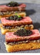 Brioche is toasted with house butter. The wagyu is cut into blocks and seared on all sides, maintaining the beef inside rare. This technique is known as tataki and is traditionally used in tuna. Seared outside, rare inside. The beef is then sliced thin and placed on top of the brioche that has been toasted and topped with mushroom duxelles or mushroom paste. The dish is topped with Caviar and micro greens. Allergies = Garlic, Pepper, Gluten, Egg
