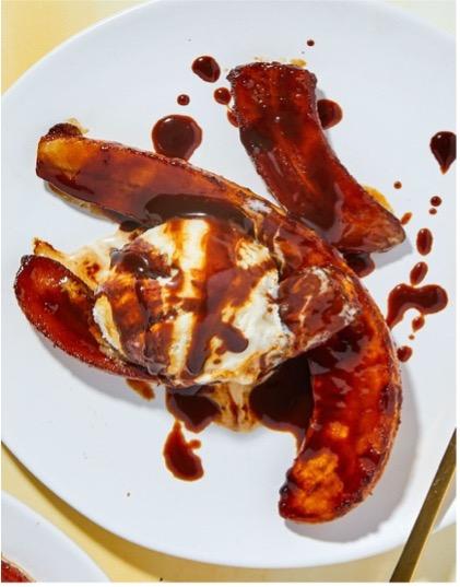 Banana a la parrilla, Pochoclo caramelizado, Baylee’s Foam
