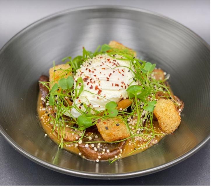 Mushroom mixture is smoked on our woodfire grill then sauteed with sliced onion, garlic. Deglazed with sake and yuzu soy. Finished with herds and butter. Served in a bowl and topped with a poached egg, toasted brioche croutons and micro chives. Allergies = Dairy, Gluten , Pepper, Sesame , Soy , Sake.