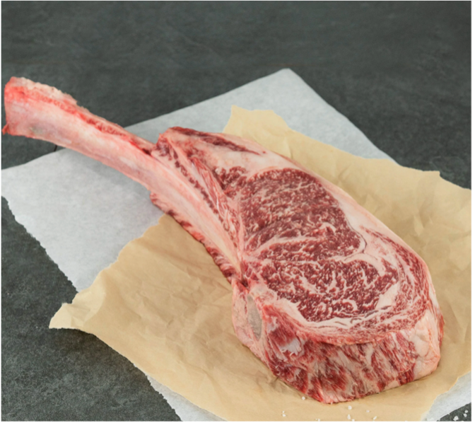 The tomahawk steak is essentially a bone-in ribeye steak. It is taken from the rib section, with the large rib bone still attached. Its appearance resembles that of a tomahawk ax. Having a bone-in ribeye insulates the meat while it cooks, making your meat more moist and tender. We grill the Tomahawk to the guest’s preference and serve it to the guest with their choice of Argentinean steak knife. The food runner torches the steak table side. Allergies = Dairy, Pepper.