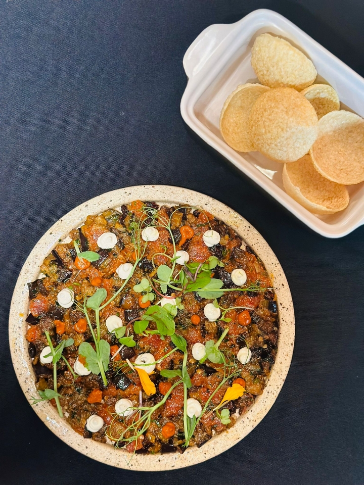 Harissa tuna, eggplant marroquí , tahini yogurt. Served with Pani Puri Harissa tuna tartare, eggplant conserva, currants, tahini yogurt, pani puri