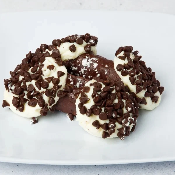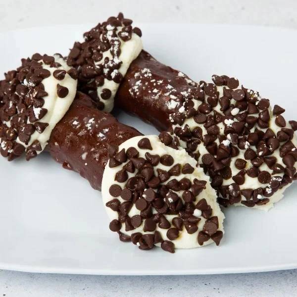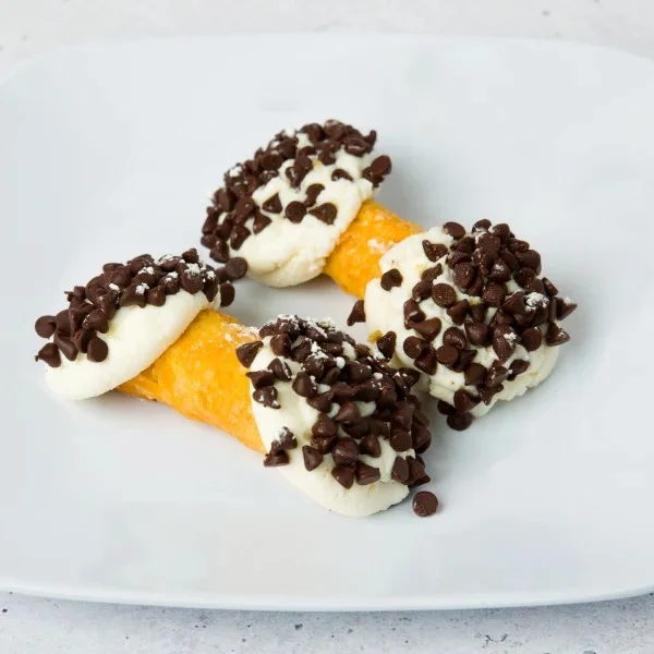 Flaky shell filled with cinnamon laced cannoli cream topped with chocolate chips & powdered sugar.