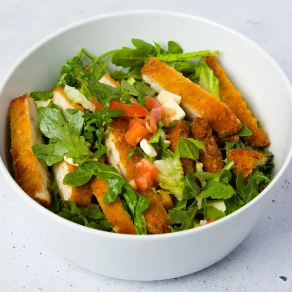 Crispy breaded chicken cutlet served over a bed of mixed greens and romaine, diced tomatoes, and fresh mozzarella, drizzled with extra virgin olive oil and lemon. Light, crispy, and bursting with flavor.