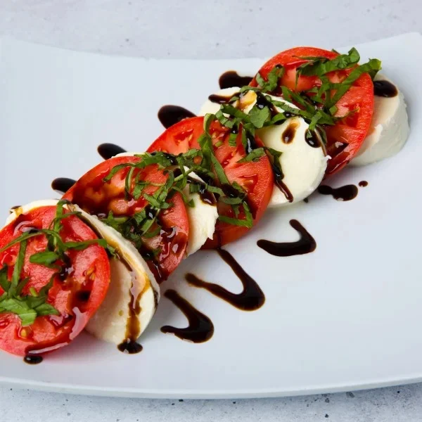 Fresh sliced mozzarella layered with thick-cut beefsteak tomatoes, fragrant basil, a drizzle of balsamic glaze, and extra virgin olive oil. Light, fresh, and delicious.