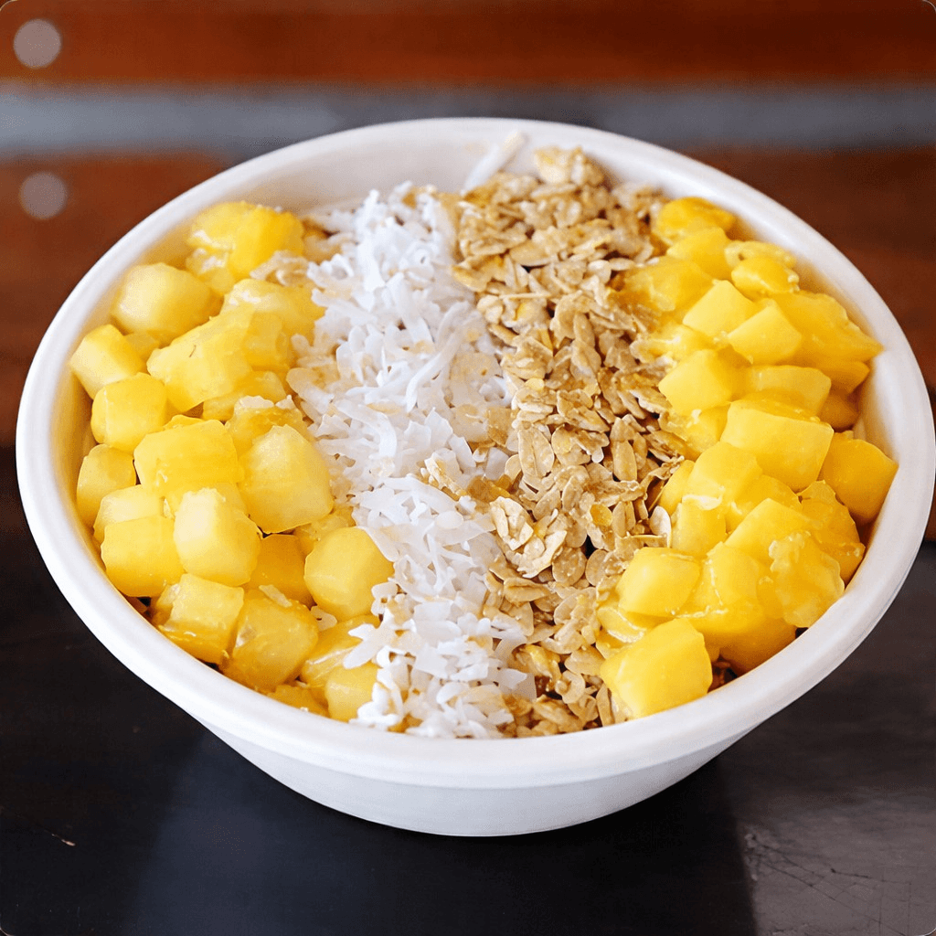 Acai base with; mango, pineapple, granola, coconut flakes & honey