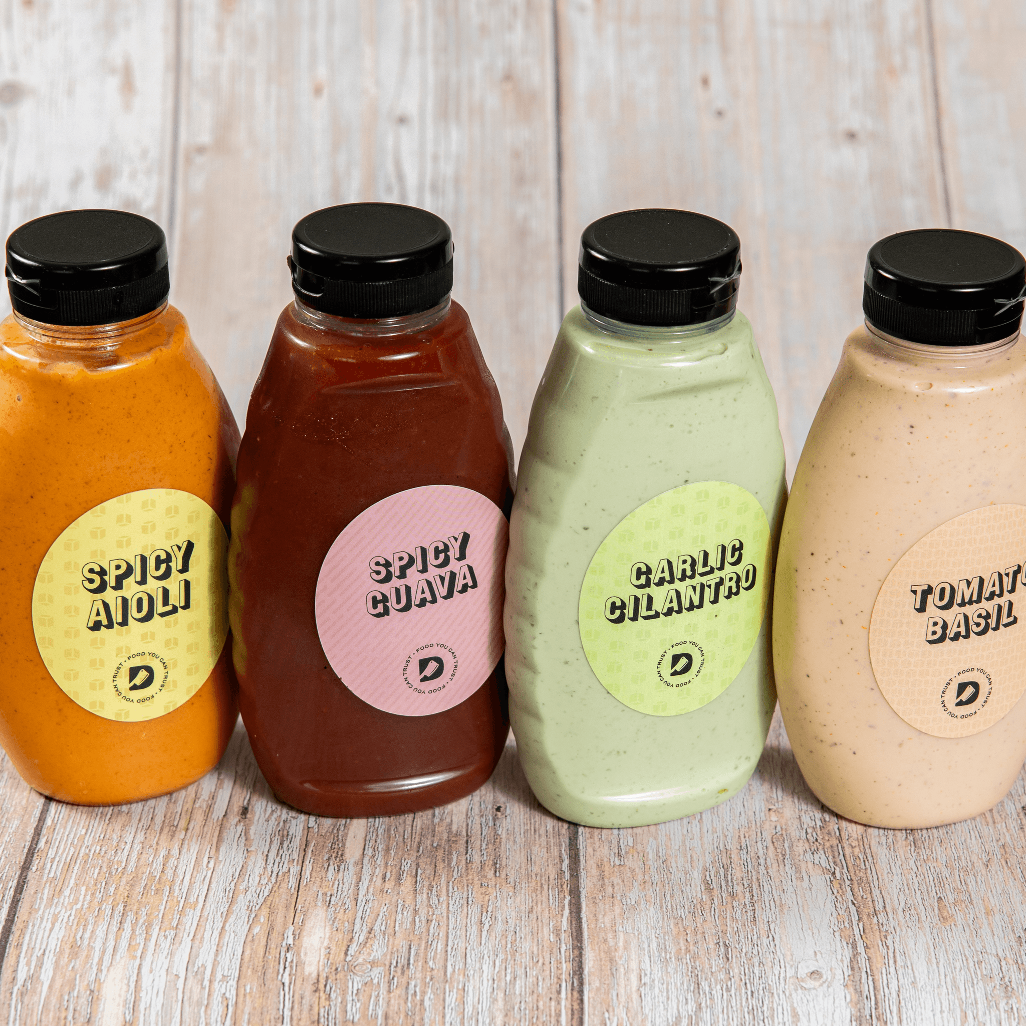 White rice, black beans, chicken, corn, cheddar cheese, 8 garlic cilantro sauces